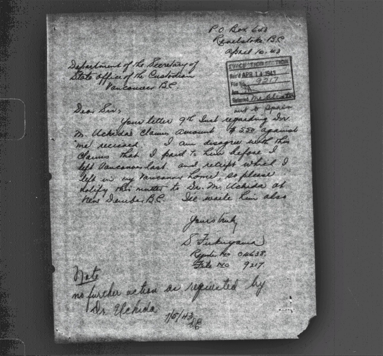 Although we saw many interesting documents that included a claim for loss of earnings while the government used his fishing boat, and correspondences between Glenn McPherson and Frank Shears to advise Senkichi’s attorney to withdraw his Bird Commission claim as they both believe that the claim is outside the terms of reference. A later letter shows the withdrawal of the $10,276.85 claim for this company and a note that concludes that the claims were outside the terms of reference.