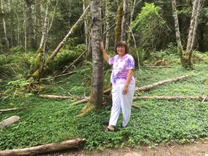 This spring, along with my mom, wife, daughter and another cousin, Kerry James, I again knocked on the door of Wayne for permission to traipse around his woods. The area we were interested in was actually owned by his neighbour, Richard, who happened to be doing some log work nearby. Upon hearing our story, he was able to point us to a more exact spot where the houses would have stood. This photo shows my mom the “front porch” of her home. “Tadaima” (I’m home)